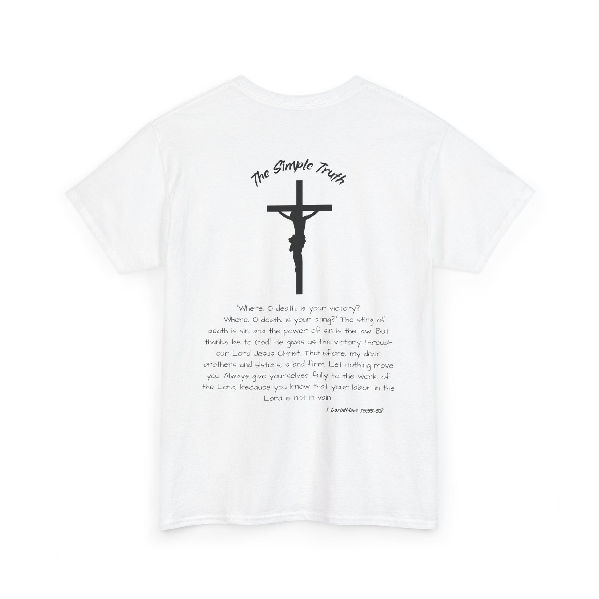 1 Corinthians 15:55-58 Black Print Bible Verse Unisex Heavy Cotton T-Shirt - From "The Simple Truth" Collection