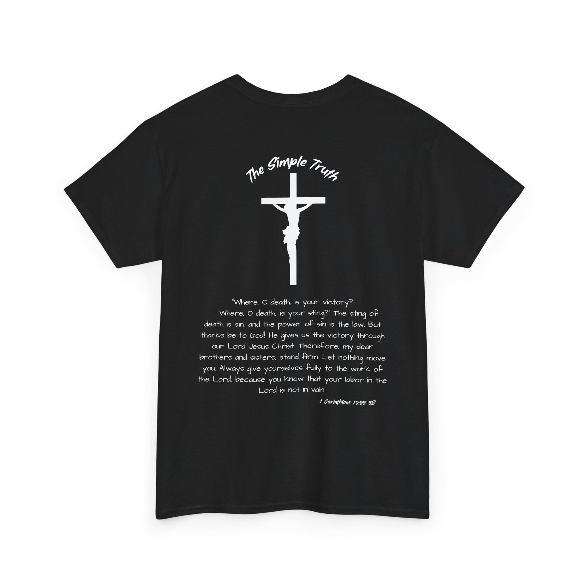 1 Corinthians 15:55-58 White Print Bible Verse Unisex Heavy Cotton T-Shirt - From "The Simple Truth" Collection
