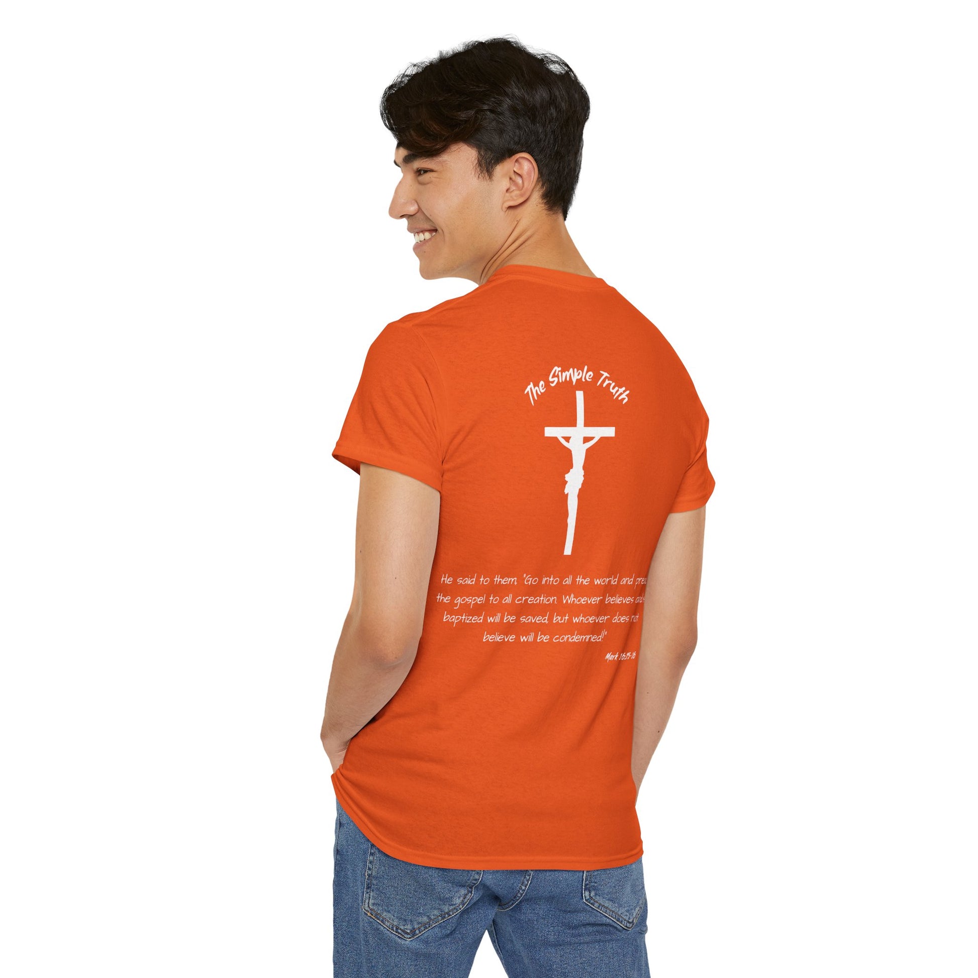 Mark 16:15-16 White Print Bible Verse Unisex Heavy Cotton Shirt - From "The Simple Truth" Collection