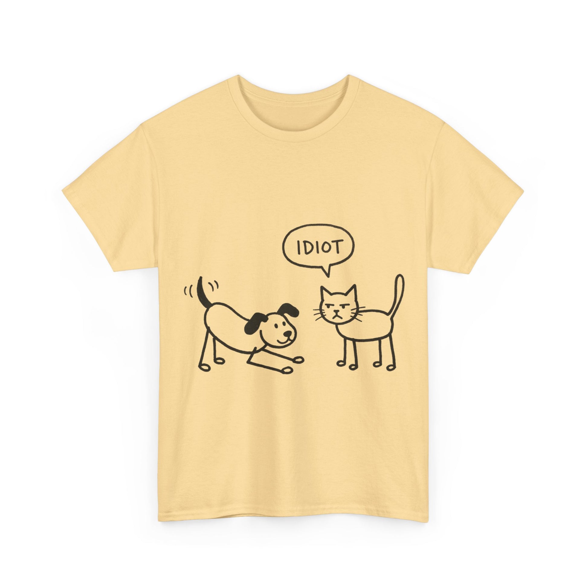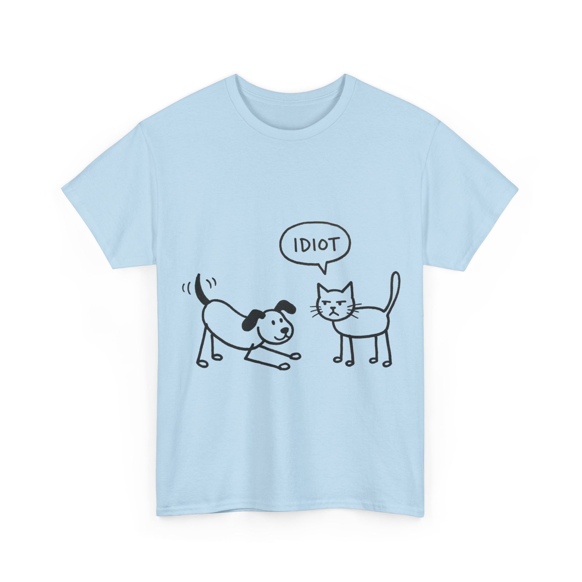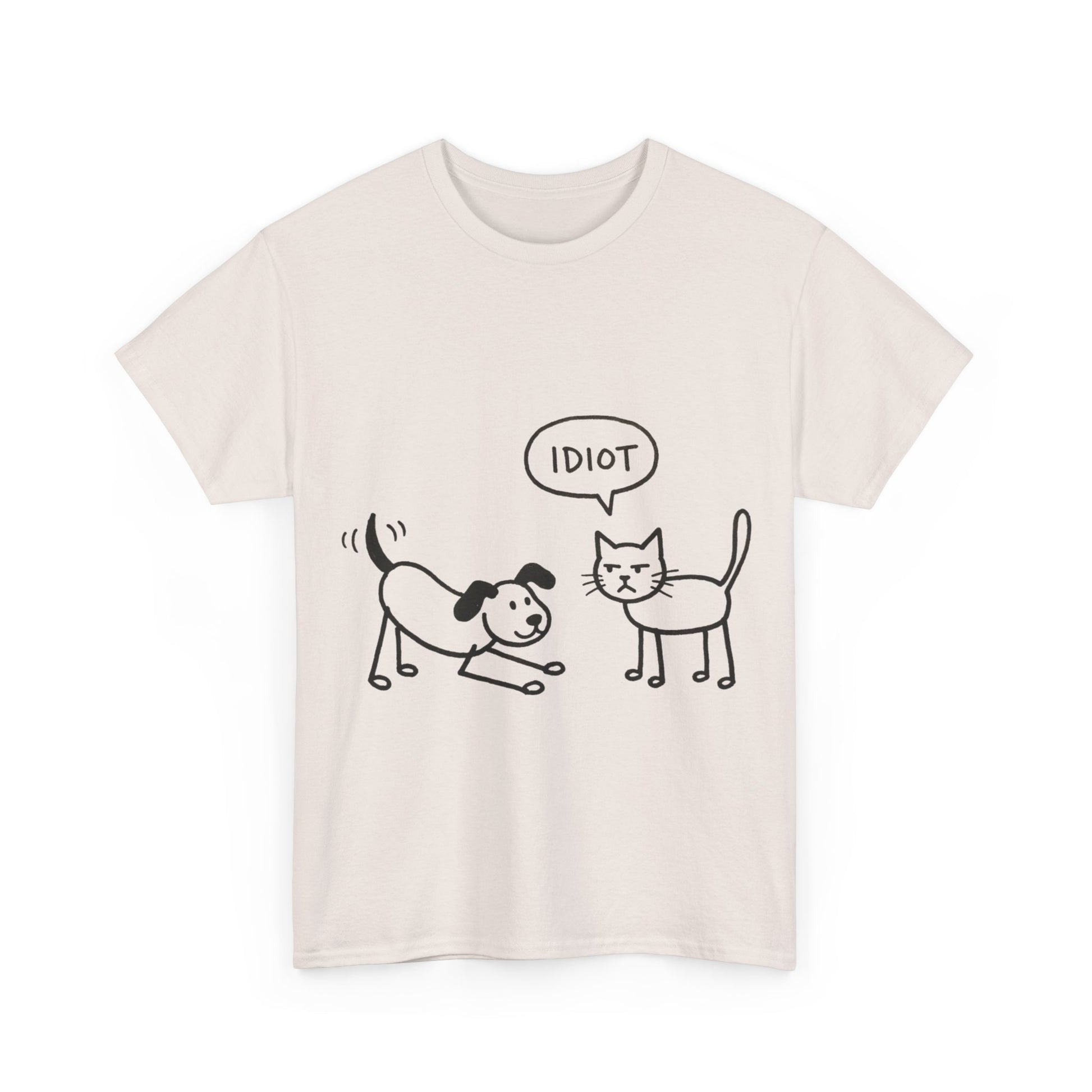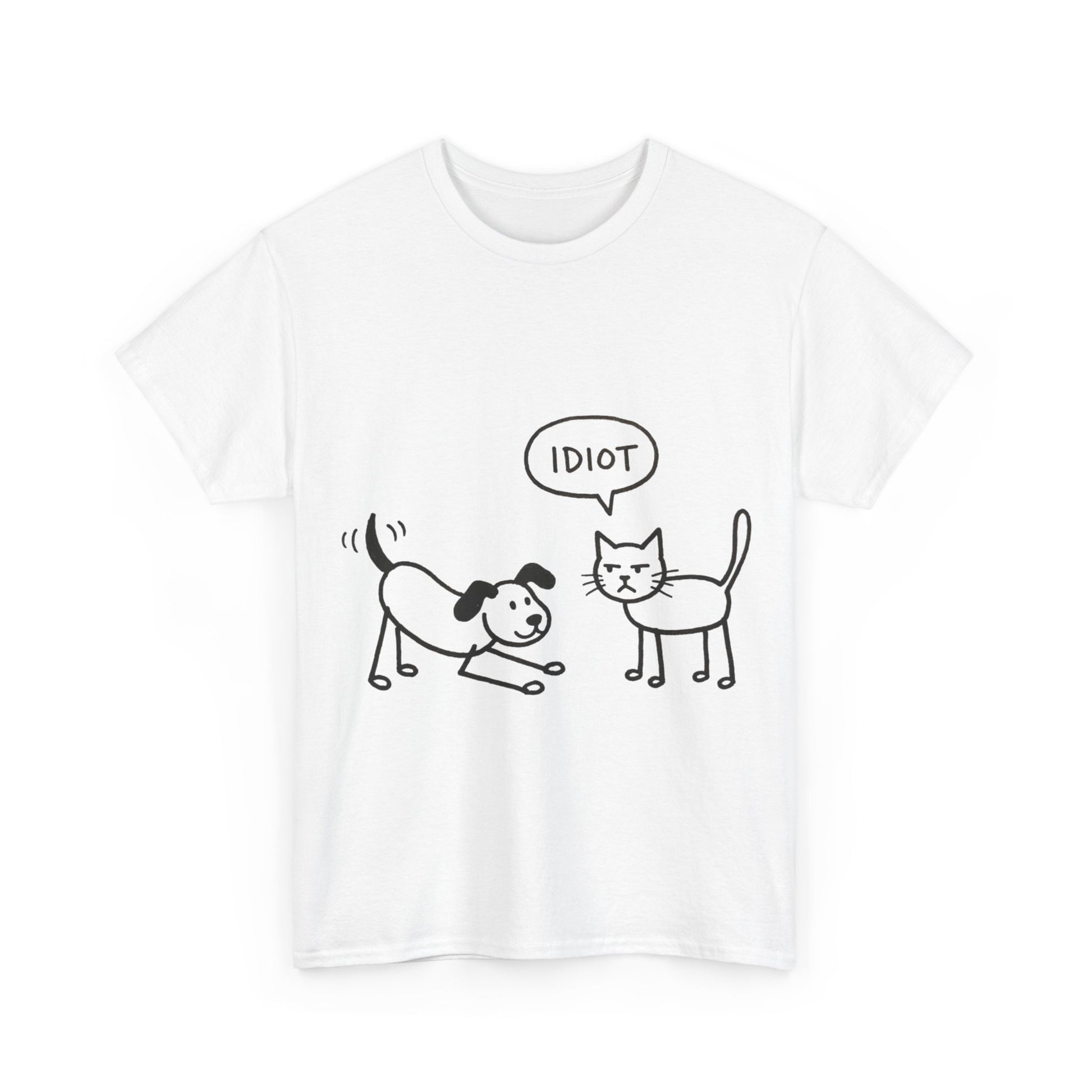Product Description: Add a dose of humor to your everyday style with this playful graphic t-shirt. Featuring a simple hand-drawn illustration of a cheerful dog and an unimpressed cat delivering a blunt one-word verdict, this shirt perfectly captures the classic pet rivalry in a relatable and comedic way. It’s a great conversation starter for animal lovers and anyone who enjoys sarcastic, minimalist humor.